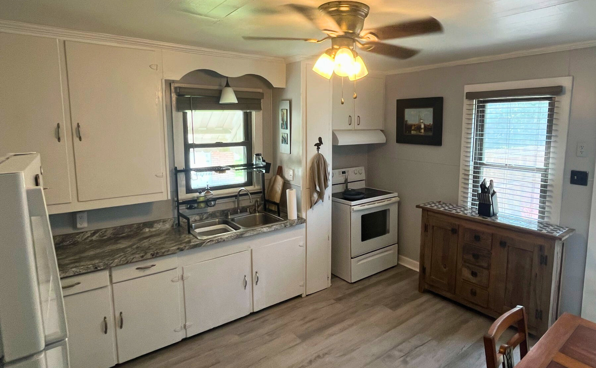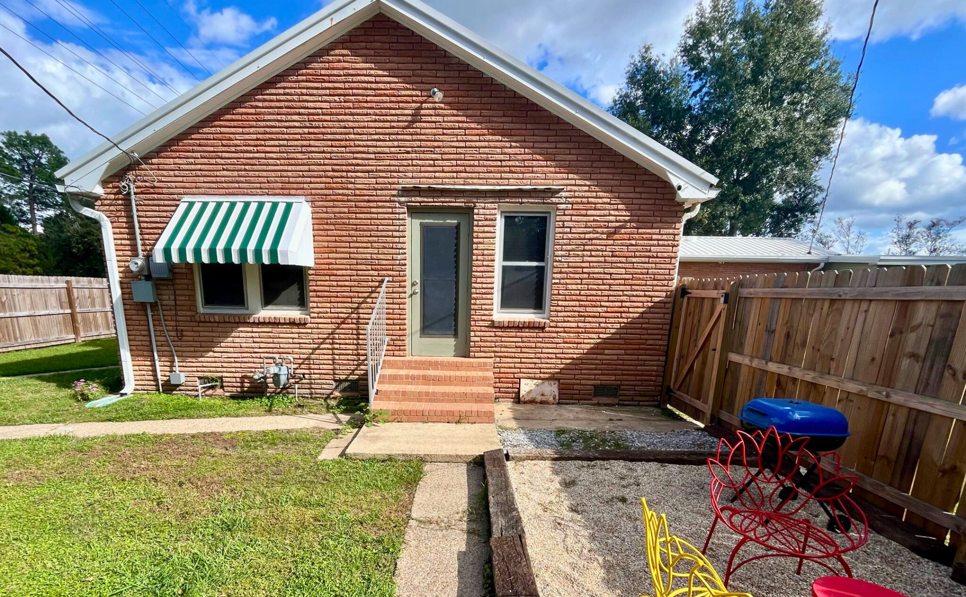 A quaint two-bedroom house in Carencro with a large kitchen, fenced yard for dogs, and cozy outdoor seating. Ideal for extended stays and remote work.